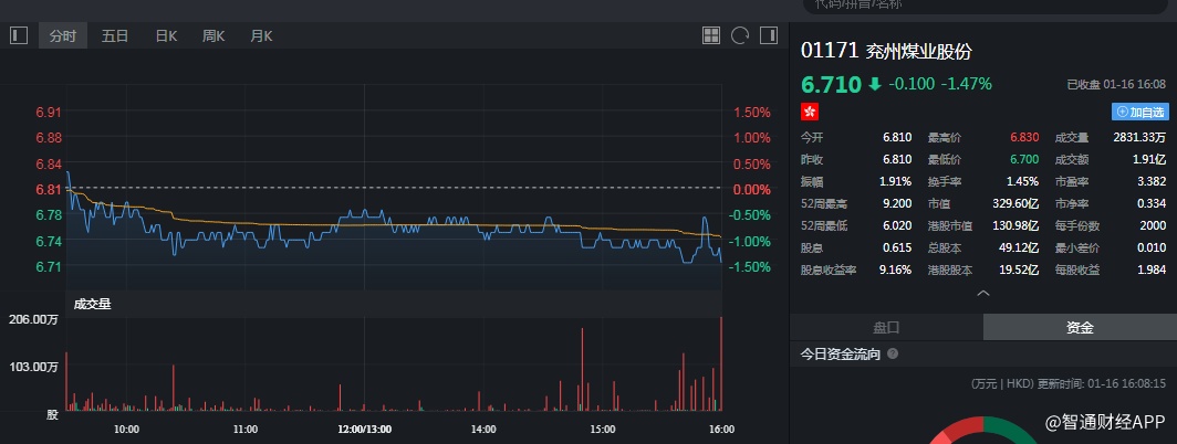 截至今日收盘,兖州煤业(01171)跌1.47%,报6.71港元。