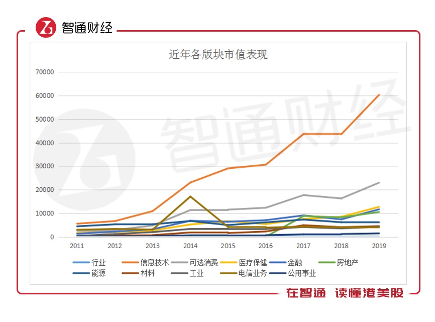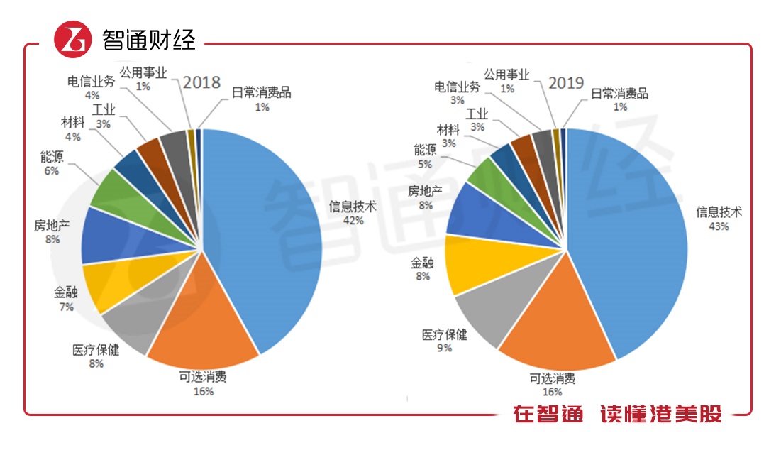据Wind数据显示,2011-2019年间,信息技术、可选消费为美股市值常年靠前的两大板块,并仍在维持快速上涨趋势。截至2019年12月31日,信息技术板块市值占比达43%,较2018年上涨1个百分点。可选消费市值占比于2019年维持16%水平。两大板块占据美股59%市值比重。
