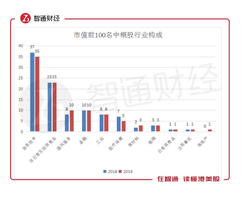 在市值构成上,与整体美股板块相似,信息技术与可选消费板块构成中概股市值前100名主要组成。智通财经APP了解到,2019年市值前100名中概股中,信息技术板块达35家,非日常生活消费品达23家、通讯服务10家、金融10家、工业8家、医疗保健5家、原材料3家、能源3家、日常消费品1家、公用事业1家、房地产1家。其中,信息技术比重较去年微幅下降,非日常生活消费品比重维持原有水平。
