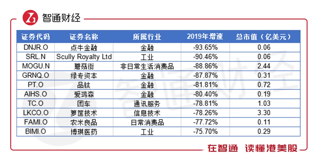 智通财经APP了解到,截至2019年度,市值跌幅前10的中概股中,P2P公司点牛金融(NDJR.US)居首,全年市值跌幅达93.65%;截至2019年,点牛金融市值降至0.06亿美元。品钛(PT.US)、爱鸿森(AIHS.US)全年市值也下跌80%以上。整体来看,2019年市值跌幅前10的企业中,金融企业占主要比重。