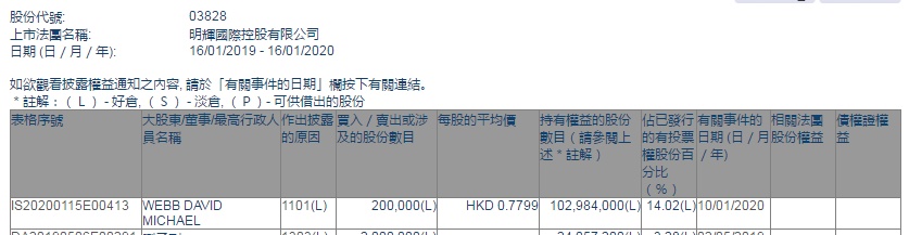 Michael增持明辉国际(03828)20万股,每股作价0.77港元,总金额约为15.4万港元。增持后最新持股数目约为1.02亿股,最新持股比例为14.02%。