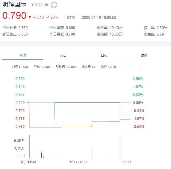截至今日收盘,明辉国际跌1.25%,报0.79港元。