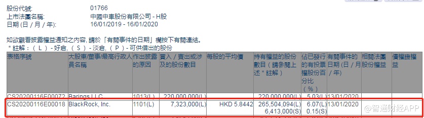 智通财经APP获悉,联交所最新资料显示,1月13日,贝莱德增持中国中车(01766)732.3万股,每股作价5.84港元,总金额约为4276.63万港元。增持后最新持股数目约为2.65亿股,最新持股比例为6.07%。