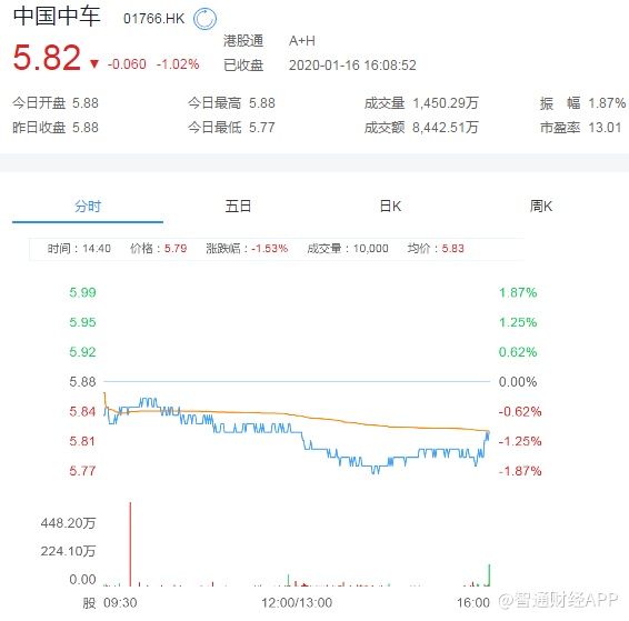 截至今日收盘,中国中车跌1.02%,报5.82港元。