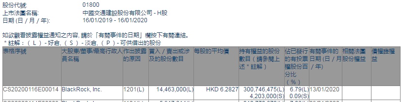 智通财经APP获悉,联交所最新资料显示,1月13日,贝莱德减持中国交通建设(01800)1446.3万股,每股作价6.28港元,总金额约为9082.76万港元。减持后最新持股数目约为3亿股,最新持股比例为6.79%。
