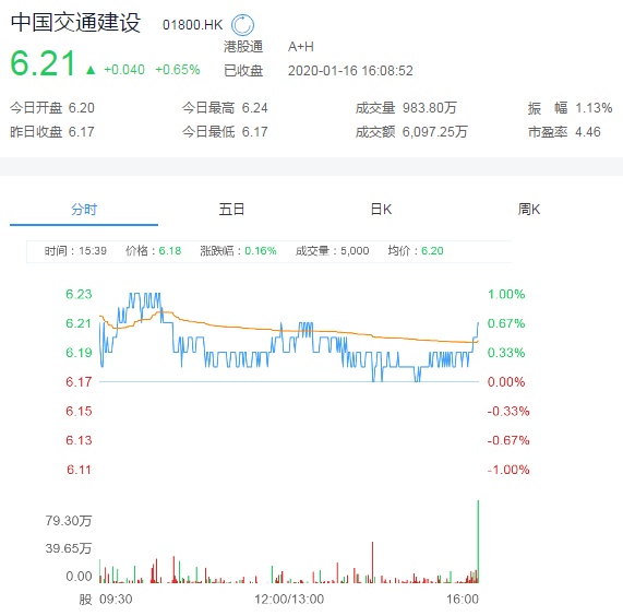 截至今日收盘,中国交通建设涨0.65%,报6.21港元。