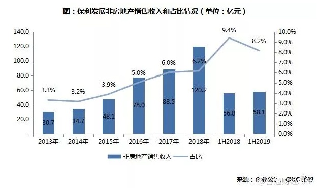 2019年上半年,保利发展非房屋销售营业收入58.07亿元,占企业总营业收入的8.2%,同比减少1.2个百分点。近年来,随着保利发展的多元化业务迎来增长期,以及企业对多元化业务的加大投入,保利非房地产销售产生的收入占比持续性上涨,从2013年的3.3%上涨到2018年的6.2%,但占比增幅在下降。