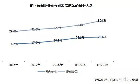 从保利的盈利情况来看,2019年上半年保利物业毛利率为23.6%,同比增长0.5个百分点,较2016年提升有近7个百分点。但保利物业毛利率相较于保利发展的地产主业39.77%的毛利率较低,而由于保利物业纳入保利发展并表,拖累保利发展主业盈利率。不过未来随着保利物业的上市,将对保利发展的市场估值起到积极的作用。