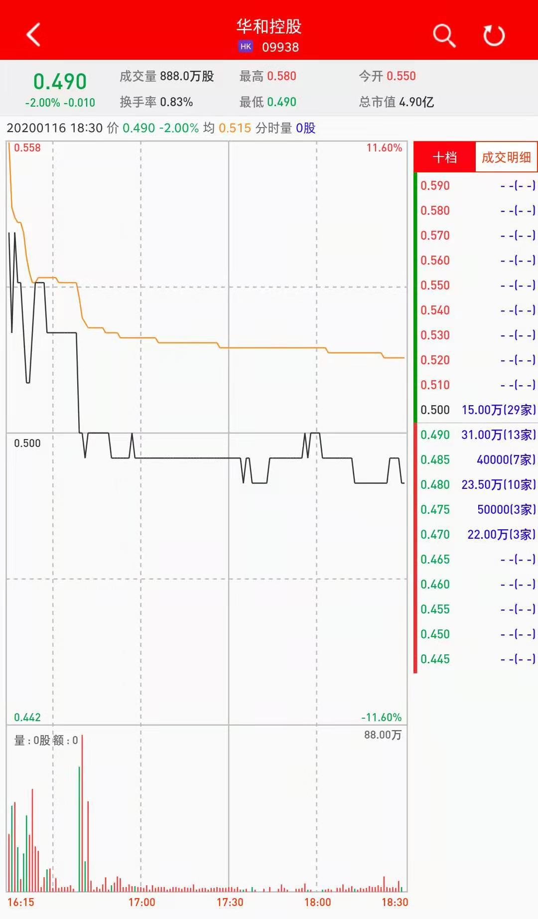 智通财经APP获悉,华和控股(09938)将于1月17日在香港挂牌,截止收盘,利弗莫尔证券暗盘交易显示其报价0.49港元,较招股价0.5港元跌2%。每手5000股,不计手续费,每手亏50港元。