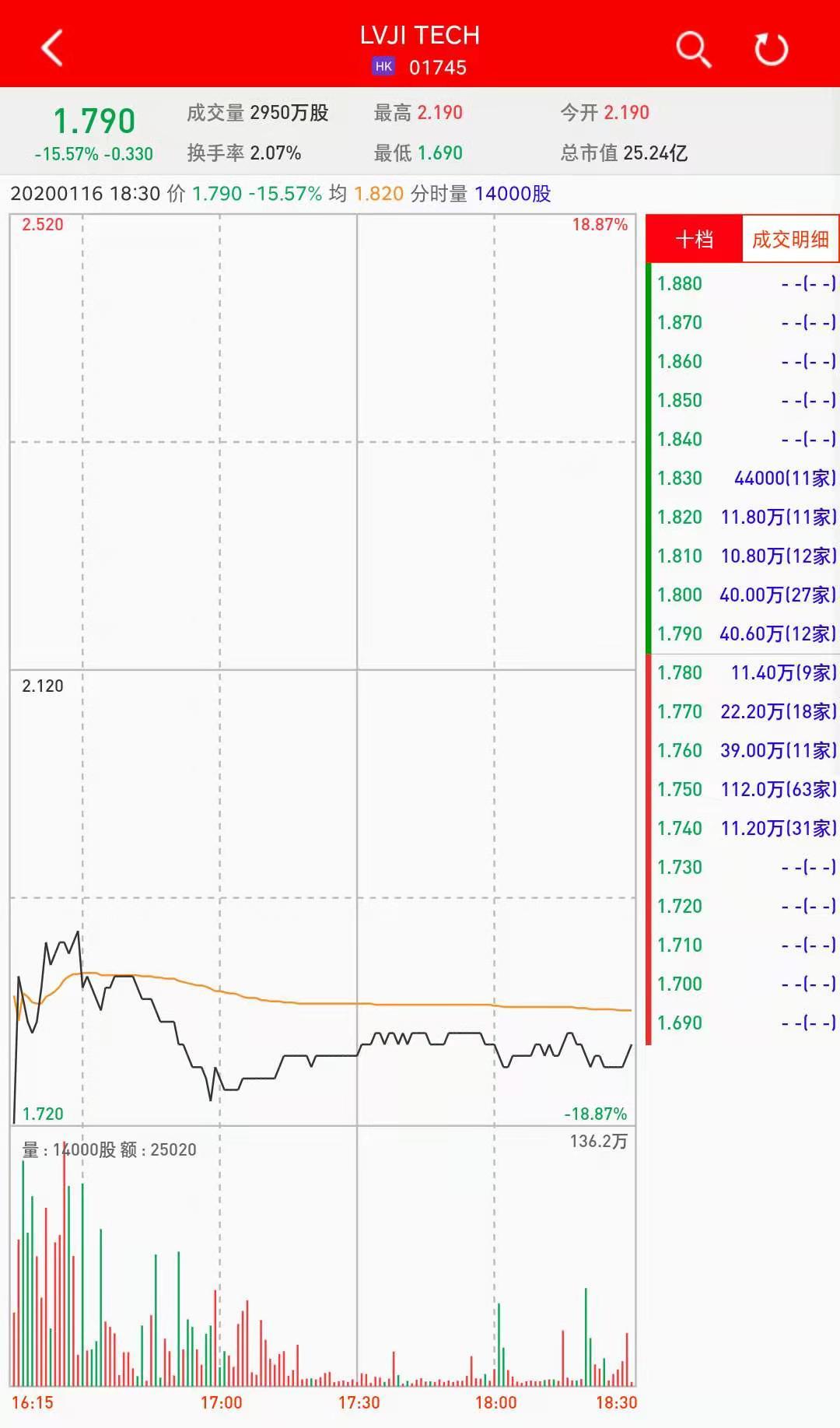 智通财经APP获悉,驴迹科技(01745)将于1月17日在香港挂牌,截止收盘,利弗莫尔证券暗盘交易显示其报价1.79港元,较招股价2.12港元跌15.57%。每手2000股,不计手续费,每手亏660港元。