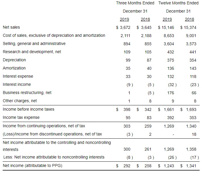 基于以上因素,PPG预期2020全年销售额以固定汇率计算将同比增长1-3%。不计汇率影响,调整后每股收益将增长4-9%。