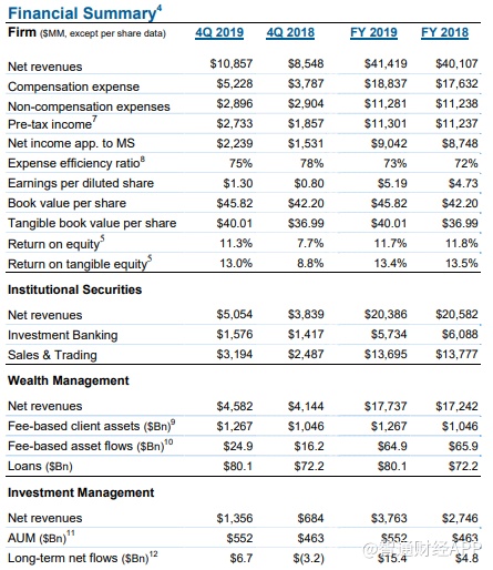 分业务来看,机构证券业务第四季度净收入连续第四个季度净收入超过50亿美元,而其全年业绩反映了各产品的稳健表现,尽管市场背景喜忧参半。而财富管理业务全年税前利润率为27.2%,一定程度上反映了该公司2019财年创纪录的净收入和税前收入。投资管理业务的结果反映了四季度以及全年应计利息的强劲增长和较高的费用收入。另外,资产管理的规模增长了19%,反映出其持续强劲的正净流量。