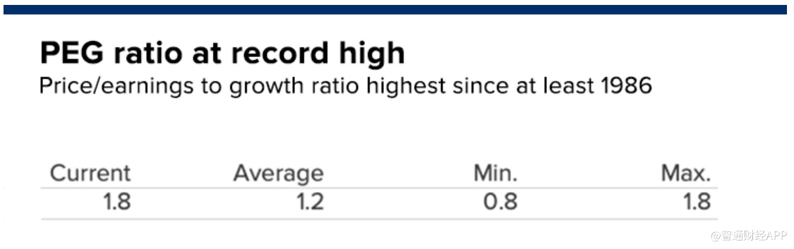 智通财经APP获悉,分析指出,目前美股市盈率相对盈利增长比率位于1.8,这是自1986年市场开始使用该指标以来的最高水平。