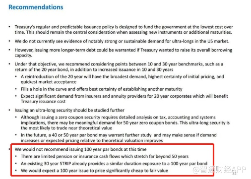 尽管TBAC对50年期公债的需求持悲观态度,但其明确建议不要发行100年期公债,因"超过50年期的养老金或保险现金流有限,且剥离的30年期公债较好满足与100年期公债类似的存续期。"