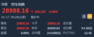 智通财经APP获悉,恒生指数开盘高开0.36%,报28988.16点。国企指数涨0.39%,报11372.22点。红筹指数涨0.39%,报4621.06点。大市盘前成交54.3亿港元。