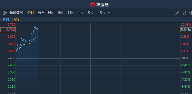 智通财经APP获悉,慧聪集团(02280)盘中大涨近10%,突破多条均线,创近两个月新高,截至10时14分,涨9.64%,报价2.73港元,成交额568.3万。