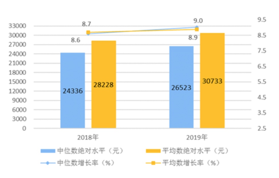 2019年,全国居民人均可支配收入中位数26523元,增长9.0%,中位数是平均数的86.3%。其中,城镇居民人均可支配收入中位数39244元,增长7.8%,是平均数的92.6%;农村居民人均可支配收入中位数14389元,增长10.1%,是平均数的89.8%。