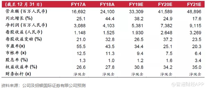 维持买入评级,目标价微调至90.26港元。我们维持买入评级,并将目标价微调至90.26港元,基于30倍20财年预测市盈率不变,相当于1.5倍的三年PEG。公司估值现为25.1倍市盈率或1.2倍PEG,十分有吸引力。我们下调19 / 20 / 21财年摊薄后每股盈利预测8.8%/ 1.3%/ 0.1%,以反映1)股份完全摊薄后的股数增加,以及2)公司发行可转债后可立刻偿还5亿欧元债务。