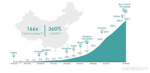 作为“二房东”,蛋壳公寓坚持“扩张优先”,在过去短短的4年里,迅速进入北京、深圳、上海、杭州、天津、武汉、广州等13座城市。据招股书显示,蛋壳公寓截至2019年11月30日共运营432690间房间,与2015年底相比,房间数增长了176倍。
