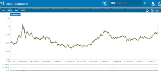 智通财经APP了解到,作为金地集团布局香港资本市场的重要落子,金地商置于2020年1月16日突然迎来17.14%的巨大涨幅,当日成交的1.06亿股和1.22亿港元,较之平时刚迈入千万门槛的成交而言有着明显放量迹象,盘中20%最大涨幅对应的1.26港元,也是公司自2000年开始的近20年股价新高。
