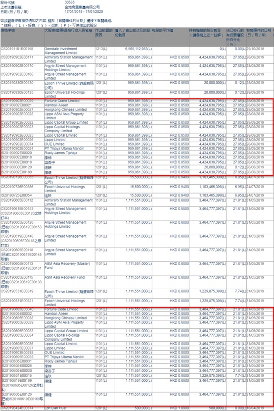 在业绩增长基本没有后顾之忧的时候,大股东在资本市场方面已经开始有所动作了。智通财经APP了解到,金地商置于2019年5月31日出了一笔涉及11.12亿股的大笔交易,其中连轶、时盛有限公司共用的11.12亿股以0.88港元价格,被李棕、梁杏子等大股东收入囊中,后者股权比例由之前的14.83%提升至21.81%。之后不久的8月28日,连轶、时盛有限公司持有的9.6亿股再度以0.85港元的价格,被李棕、梁杏子等大股东再次接纳,至此前者股权比例仅剩0.12%,后者股权比例则升至27.85%。