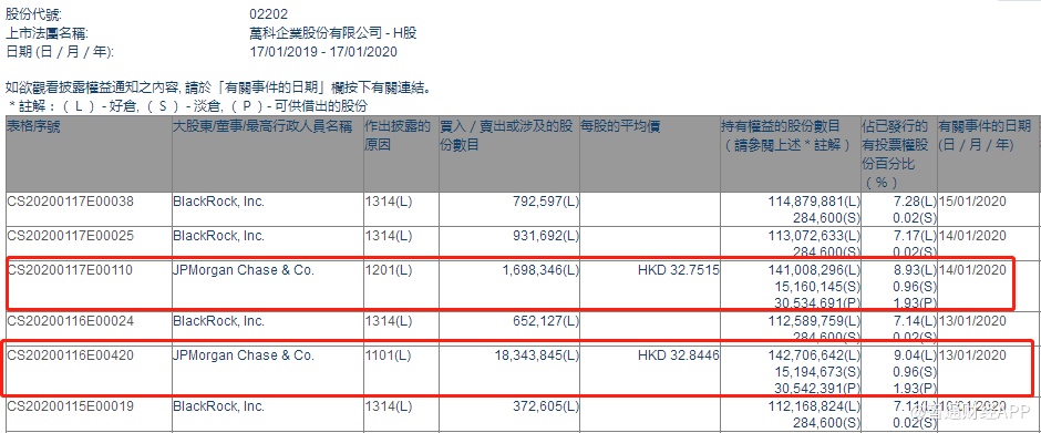 智通财经APP获悉,联交所最新资料显示,1月13日,摩根大通增持万科(02202)1834.38万股,每股作价32.8446港元,总金额约为6.02亿港元。但14日摩根大通减持万科169.83万股,每股作价32.7515港元,总金额约为5562.19万港元。最新持股数目约为1.41亿股,最新持股比例为8.93%。