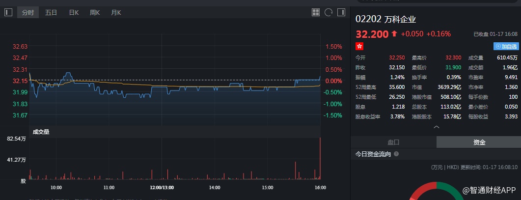 截至今日收盘,万科涨0.16%,报32.20港元。