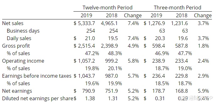 2019年第四季度公司净收益为178.7美元,与2018年第四季度相比增长了5.9%。与2018年第四季度的0.29美元相比,公司2019年第四季度的摊薄每股净收益为0.31美元,增长了5.4%。调整对2018年第四季度净收益产生不利影响的离散税目后,2019年第四季度的每股净收益和摊薄净收益将分别增长4.0%和3.4%。