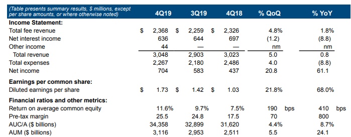 截止至2019年12月31日,道富银行的资管规模已达3.11万亿美元,同比增长24.1%,环比增长5.5%。其普通股平均回报率为11.6%,较去年同期上升410bps,较三季度上升19.bps。