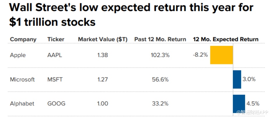 但根据FactSet的数据,分析师认为这三家公司在未来12个月内将没有或只能带来微薄的回报。共识认为,苹果将在未来一年下跌8.2%,微软将上涨3%,Alphabet将上涨4.5%。