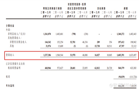 2019年,大众金融控股录得营收16.05亿港元,同比减少约2800万港元或1.7%,其中零售及商业银行业务、股票经纪及财富管理服务、其他服务营收分别为15.37亿港元、5198万港元及1603万港元,收入占比分别为95.8%、3.2%、1%。