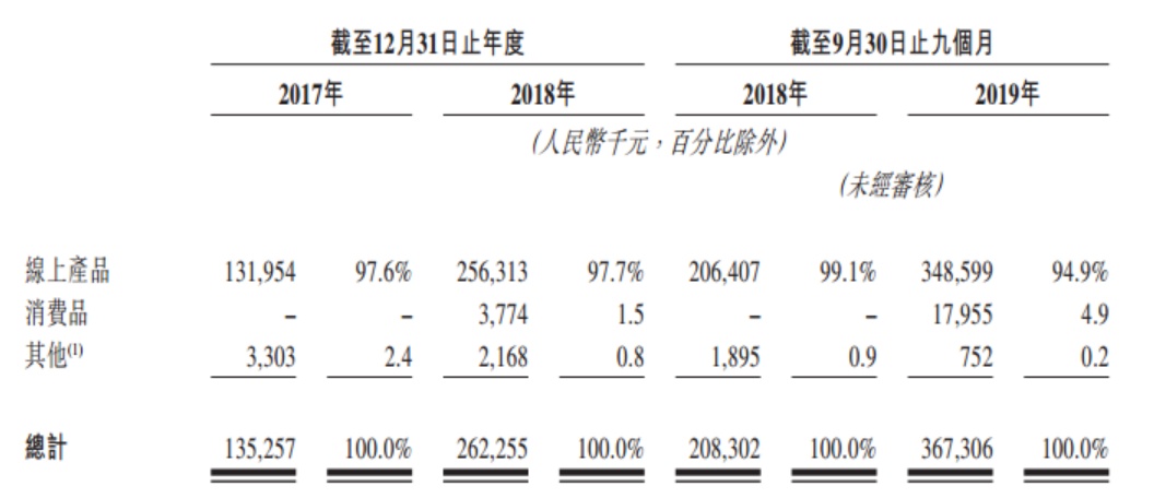 该公司的主要收入来自线上产品业务。于2017年、2018年及截至2019年9月30日止九个月,乐享互动录得收益1.35亿元、2.62亿元及3.67亿元,毛利为4541.1万元、6606.5万元及9147.9万元,而其中线上产品业务占收益比例分别为97.6%、97.7%及94.9%。