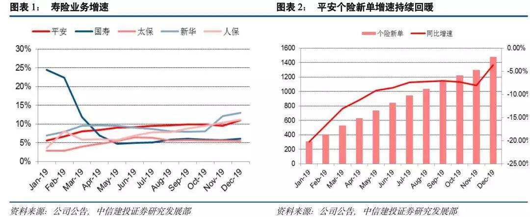 2019年业务收尾,上市险企全年保费规模分别为国寿5684亿、平安5237亿、太保2124亿、新华1381亿、人保1206亿。12月单月保费增速除中国太保以外,其他公司均实现两位数增长,平安增长高达30.7%,新华28.9%、人保28%、国寿13.4%,在备战开门红同时不忘打好收官战;全年保费增速新华13%>人保11.1%>平安11%>国寿6%>太保5.5%,对比前期累计保费增速,平安、新华、人保出现明显翘尾行情,将全年保费增速抬升至10%以上。