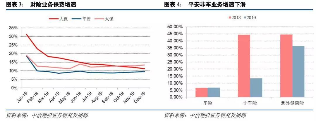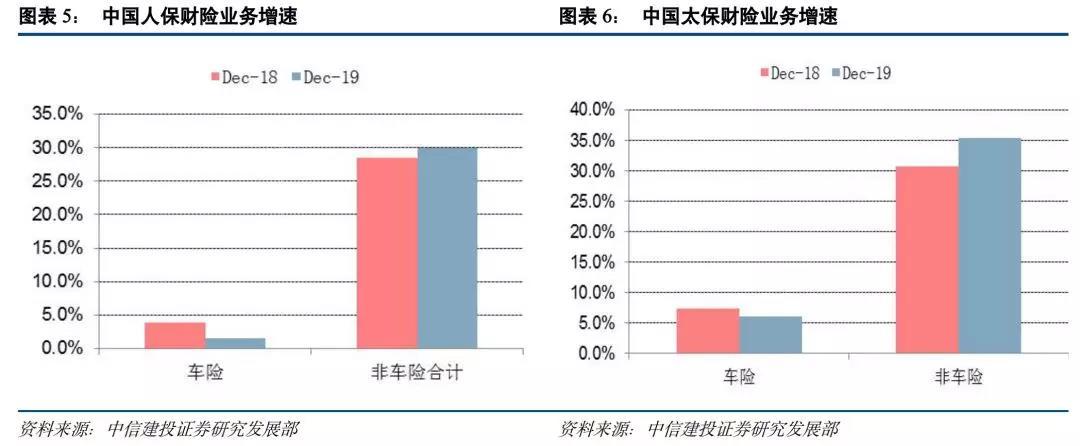 寿险业务全年保费增速新华13%>人保11.1%>平安11%>国寿6%>太保5.5%,对比前期累计保费增速,平安、新华、人保出现明显翘尾行情,将全年保费增速抬升至10%以上。财险业务全年保费增速太保13.4%>人保11.2%>平安9.5%。其中车险业务依旧个位数低增长,非车险业务平安增速放缓,人保、太保仍保持高增长态势。
