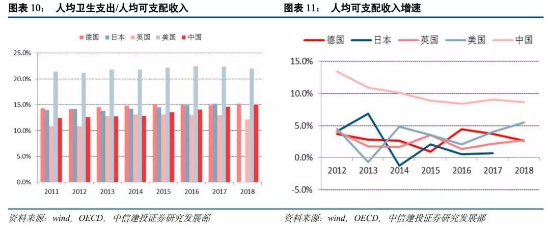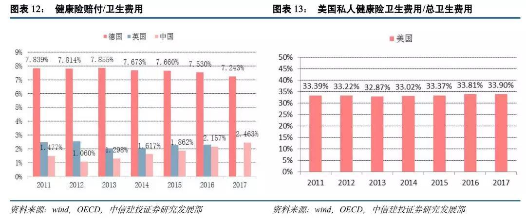 保障型产品正处于高速增长时期,居民对于健康保障需求的意识不断增强,随着人均GDP、人均可支配收入的提高,健康险密度、深度将持续提升,当前水平远低于世界平均水平,增长空间依旧充足。我们从居民的支付能力,以及社会保障对于商业保险的需求程度两个层面来分析,人均卫生费/人均可支配收入,中国与德国接近均处于15%左右的水平,美国相对较高在20%以上,我们预期这一比例还将继续增长但会在美国之下,另外我国人均可支配收入的增长速度是要明显高于对比发达国家的,因此从支付能力的角度仍然有增长空间。