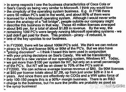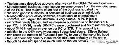Raikes说微软确实是一个简单的商业模式,你可以在几个小时或者更短的时间内学习和理解。Raikes描述微软的业务基本上分为两个单元,第一个是从卖出的每一台电脑上获得操作系统专利费: