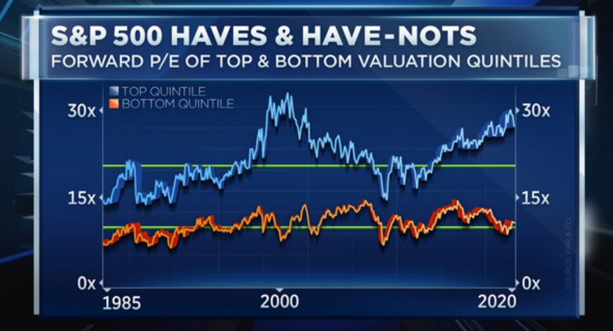 正如KKR&Co.全球宏观经济主管Henry McVey所分析的那样,这造成了一个两极分化严重的市场,20%最昂贵的股票和20%最便宜的股票之间存在巨大的估值差距。