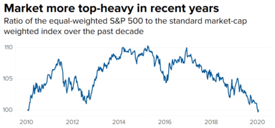 对这些赢家的过度追捧是以牺牲“平均股价”为代价,至少相对而言是这样的。我们看到标指等权重指数相对于以大型股为主导的指数有所下滑。但长期来看,等权重指数的表现却要好得多。