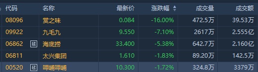 智通财经APP获悉,早盘餐饮股集体走弱。截至发稿,九毛九(09922)跌7.59%,报9.5港元;海底捞(06862)跌6.09%,报33.15港元;呷哺呷哺(00520)跌1.53%,报10.32港元;太兴集团(06811)跌1.22%,报1.62港元。
