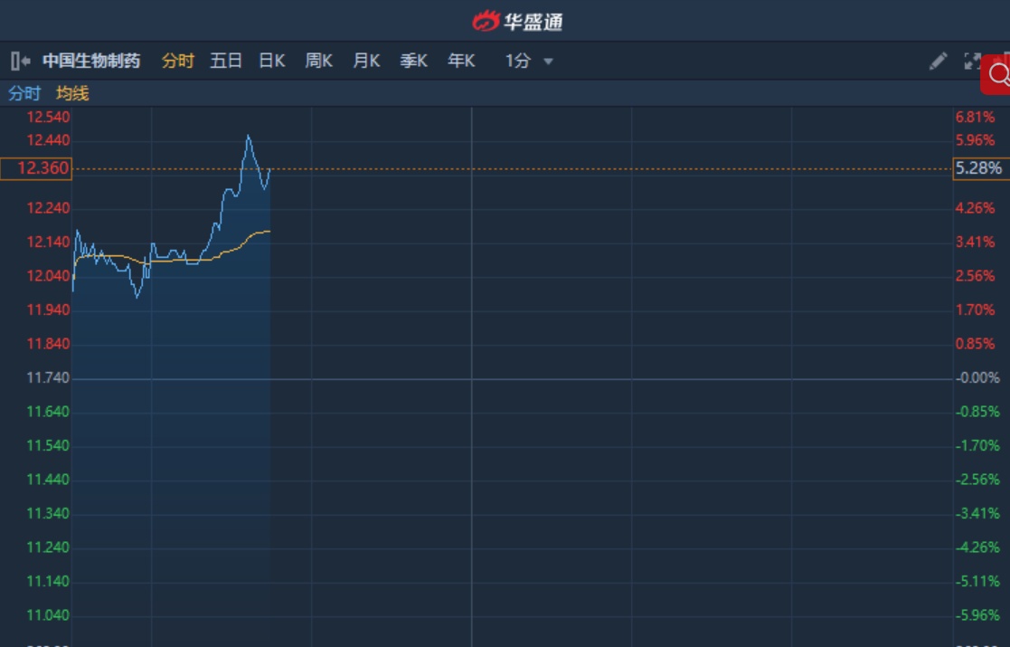 智通财经APP获悉,中国生物制药(01177)荣获2019年度国家科学技术进步奖,利好消息刺激股价大幅上扬,盘中升逾5%暂领涨蓝筹。截至10时43分,涨5.11%,报12.34港元,成交额4.56亿。