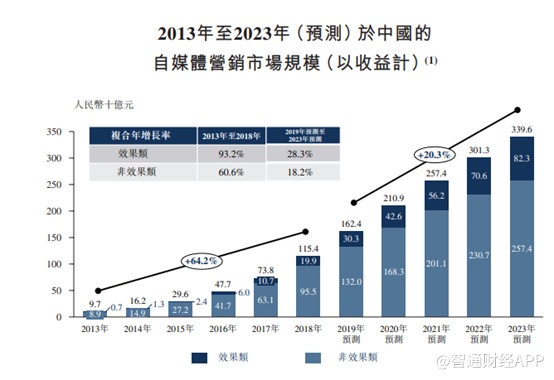 智通财经APP了解到,我国的自媒体市场发展十分迅速,2013年为97亿元人民币,2018年增长至1154亿元人民币,年复合增长64.2%,预计2018至2023年还将以20.3%的增长率持续增长。其中效果类自媒体营销作为精准营销方式,也在近两年快速发展,2013年其市场规模只有7亿元,2018年增长至199亿元,年复合增长93.2%,预计2023年达到823亿元,年复合增长达到28.3%,高于自媒体行业增速。