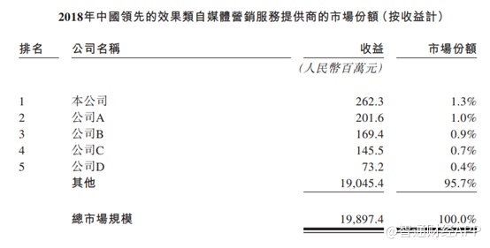 乐享互动2008年于北京成立,当时主要从事数字营销服务,并于2016年在新三板挂牌。2018年为筹备港交所上市,从新三板退市。目前乐享互动业务主要为效果类自媒体营销服务商,利用商业智能技术为行业客户及自媒体发布者提供服务。按2018年收益计,在国内市场份额为1.3%,排名第一。不过激烈的行业竞争,并未让乐享互动尝到龙头的优势。