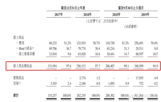 智通财经APP观察到,乐享互动的收入大部分来源于线上产品,2017至2019前九个月收入占比分别为97.6%、97.7%及94.9%,其中应用产品又占据线上产品的主要部分,2017至2019前九个月分别占总收入的51.2%、50.7%及70.4%。
