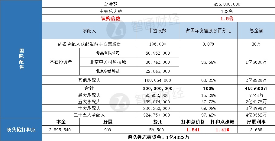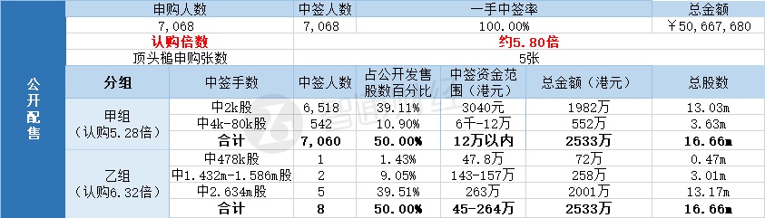 其中,公开配售申购人数7068,一手中签率100%,认购倍数约5.80倍。