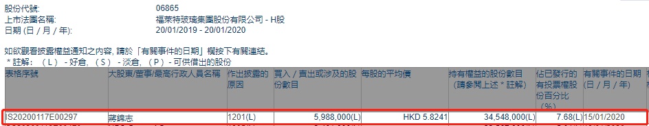 智通财经APP获悉,联交所最新资料显示,1月15日,股东蒋锦志减持福莱特玻璃(06865)598.8万股,每股作价5.8241港元,总金额约为3487.47万港元。减持后最新持股数目约为3.45亿股,最新持股比例为7.68%。