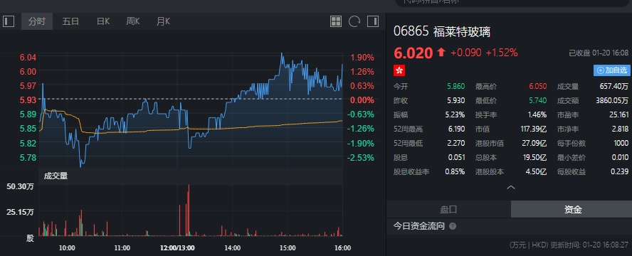 截至今日收盘,福莱特玻璃涨1.52%,报6.02港元。