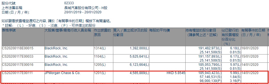 智通财经APP获悉,联交所最新资料显示,1月14日,摩根大通减持长城汽车(02333)458.5889万股,每股作价5.8545港元,总金额约为2684.81万港元。减持后最新持股数目约为1.86亿股,最新持股比例为5.99%。