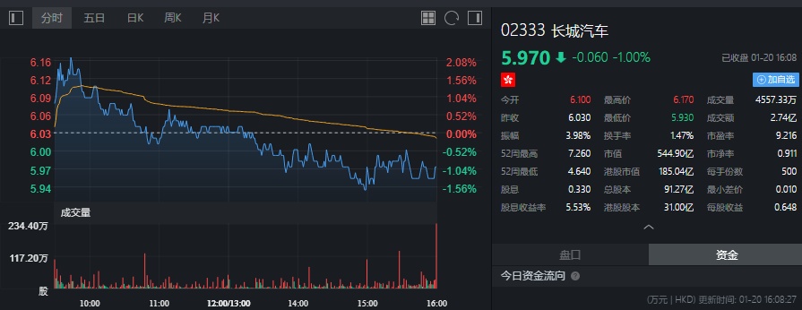 截至今日收盘,长城汽车跌1%,报5.97港元。