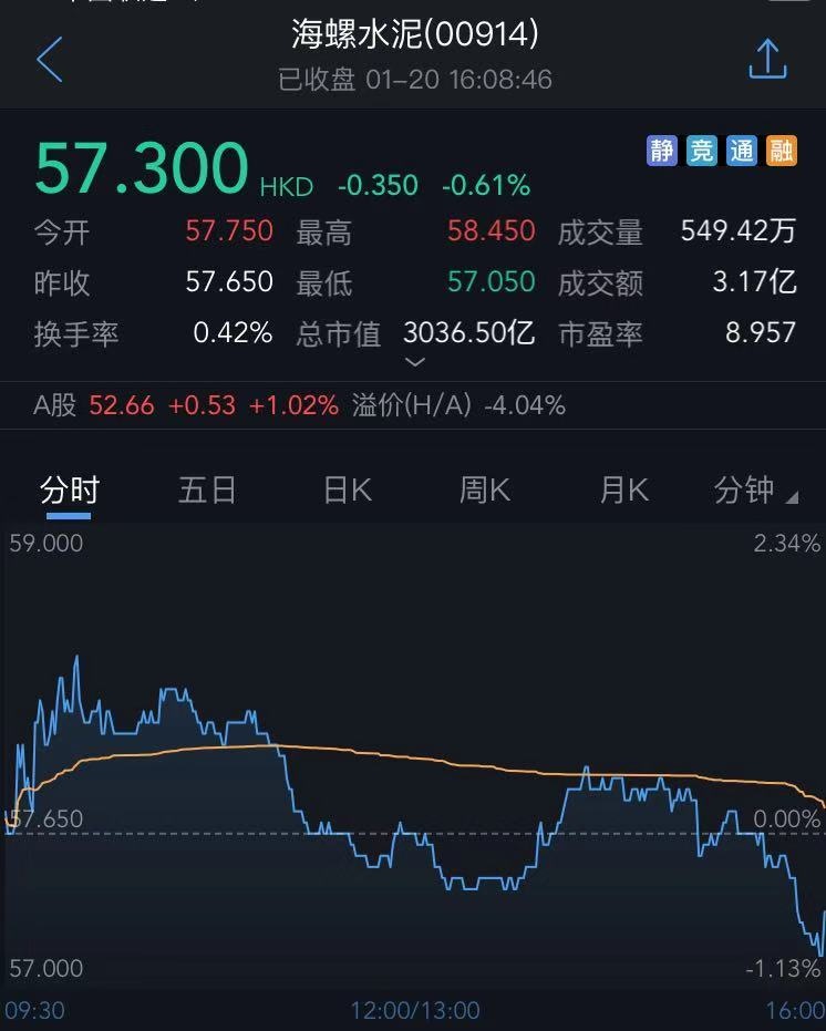 截至今日收盘,海螺水泥跌0.61%,报57.3港元。