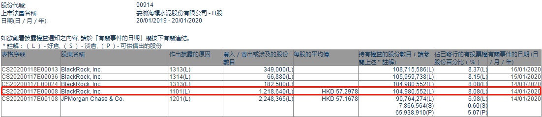 智通财经APP获悉,联交所最新资料显示,1月14日,贝莱德增持海螺水泥(00914)121.86万股,每股作价57.2978港元,总金额约为6982.54万港元。增持后最新持股数目约为1.05亿股,最新持股比例为8.08%。